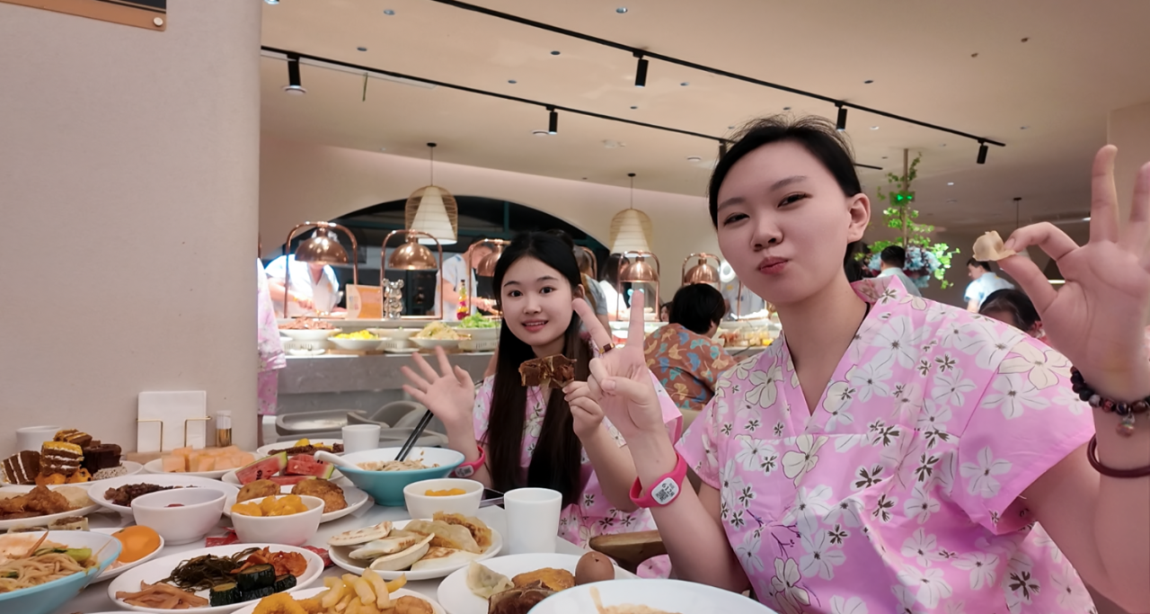 “跟伙伴们一起享用丰盛的自助餐啦”